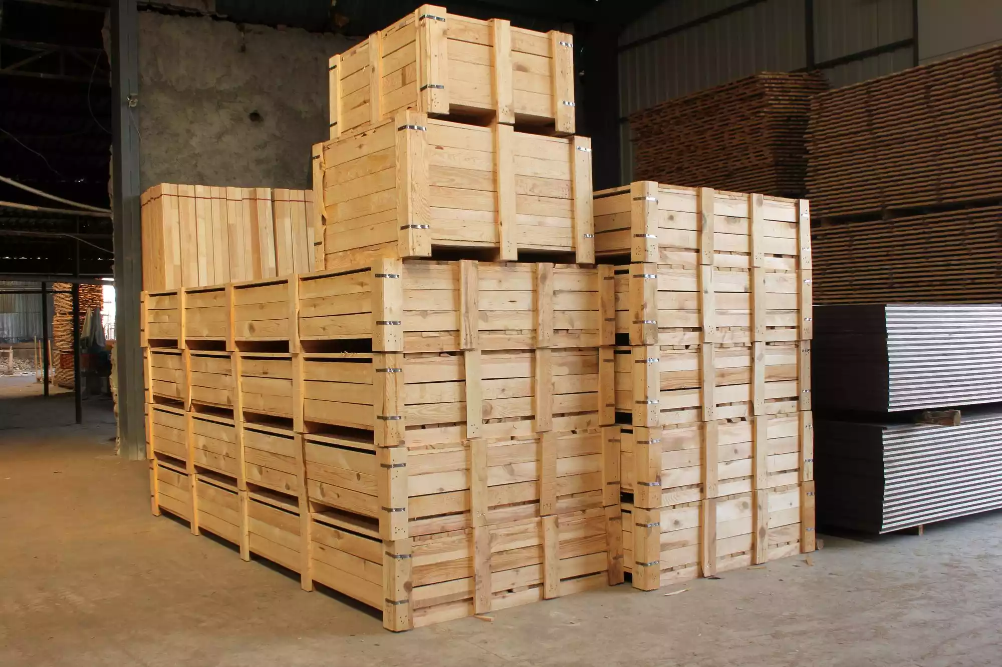 Pallets and crates are produced with precision machinery, then checked for strength.